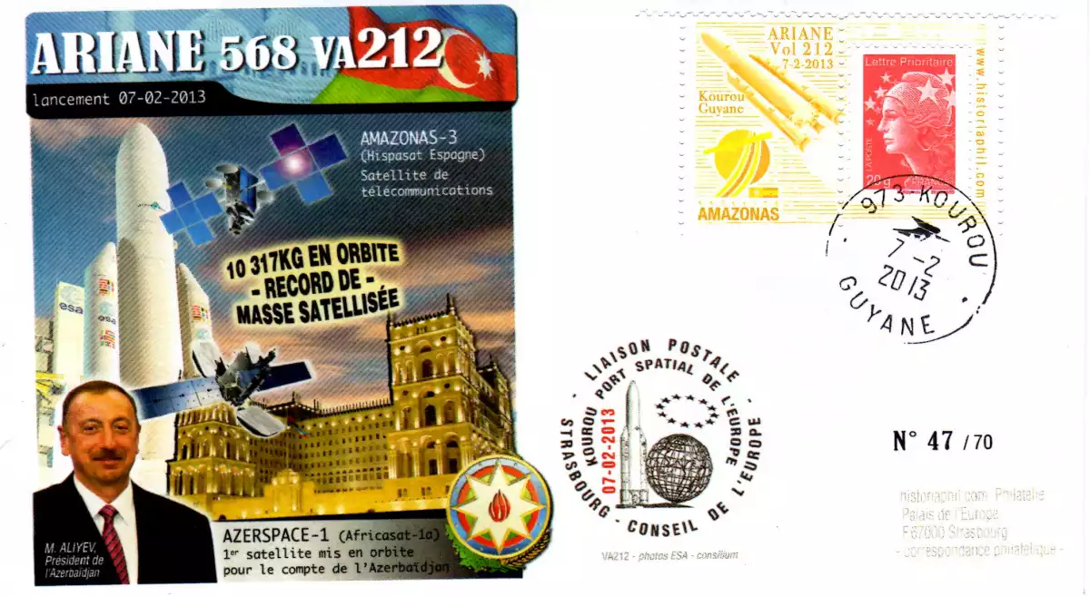 Le 7 février 2013, un lanceur Ariane 5 ECA (VA 212) place sur orbite deux satellites de télécommunication l’espagnol Amazonas 3 et l’azéri Azerspace 1 (à 46° Est). Ce dernier est alors l'un des satellites avec le signal le plus fort au-dessus de l'Azerbaïdjan. Une centaine de chaînes de télévision et de radio locales et internationales sont diffusées par satellite en azerbaïdjanais, en turc, en russe, en anglais, et quelques autres langues.