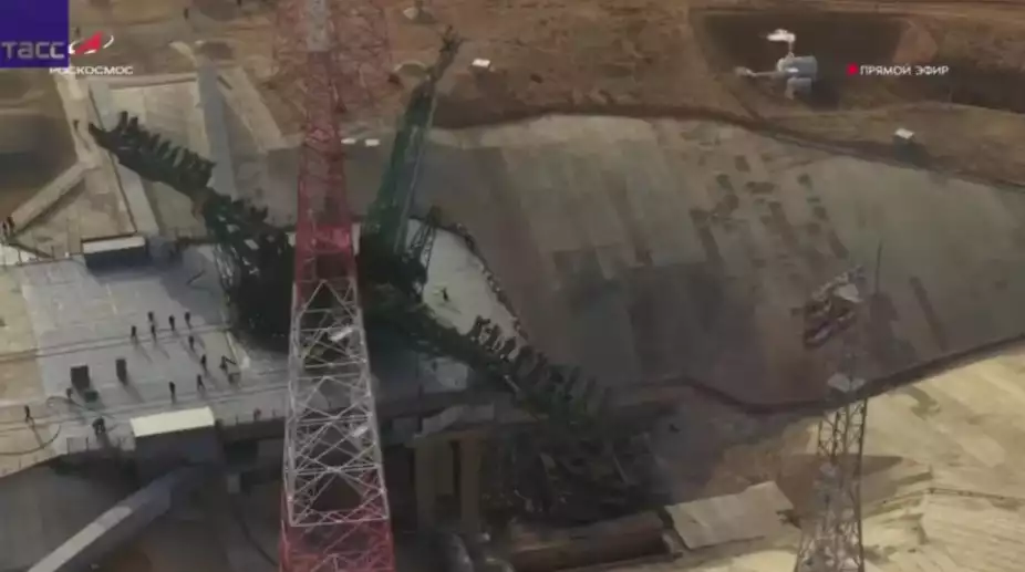 D’après le spécialiste Anatoly Zak, la partie endommagée lors du lancement est appelée « cabine de service », une plateforme de service mobile qui entre en contact avec la base du lanceur lors de son érection sur le pas de tir. Elle permet l’accès à la baie de propulsion des premiers étages de Soyouz lors des derniers préparatifs avant le décollage. Pour la protéger des flammes aux décollage, la cabine se replie dans une sorte de bunker, derrière un bouclier vertical.